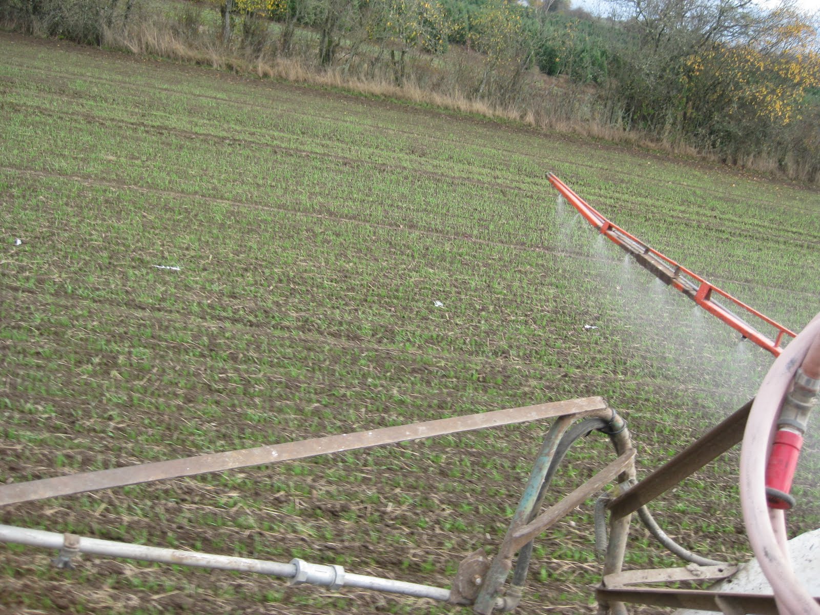 This fall we planted about 75 acres of golden and green peas as a winter cover crop. Having a legume in the ground over the winter will help increase the nitrogen in the soil for the next crop. It also helps prevent soil erosion. Not only are these peas going to provide nitrogen-fixing and "green manure" benefits, but we are being paid by the NRCS to put them in. The fields with the peas have now been limed and sprayed with compost tea in addition to the planting of the peas. The fields should provide us with much better yields on our next crop of wheat or oats.